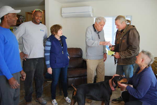 Homeowner Chris White receiving the keys to his home in Clearlake, Calif., from Habitat for Humanity Lake County President Richard Birk as his guests look on on Saturday, March 30, 2019. Courtesy photo. CLEARLAKE, Calif. – Habitat for Humanity Lake County has dedicated the 31st house it has completed for local residents in need, this time for a veteran.