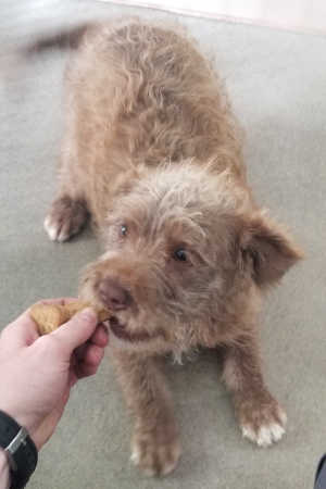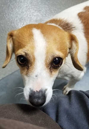 This female Chihuahua-terrier mix has a short brown and white coat.