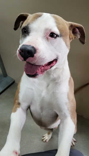 “Bobby Socks” is a female Staffordshire bull terrier-Rhodesian Ridgeback.