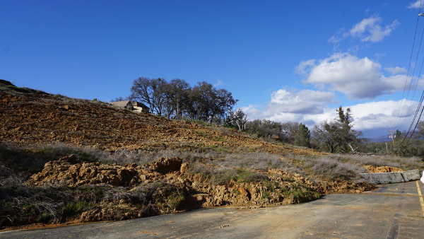 A landslide near the Lakeside Heights subdivision in Lakeport, Calif., has once again led to a closure on Hill Road. Photo by Elizabeth Larson/Lake County News.