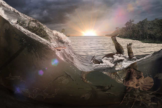 A meteor impact 66 million years ago generated a tsunami-like wave in an inland sea that killed and buried fish, mammals, insects and a dinosaur, the first victims of a cataclysm that led to Earth’s last mass extinction. The death scene from within an hour of the impact has been excavated at an unprecedented fossil site in North Dakota. Graphics courtesy of Robert DePalma. BERKELEY, Calif. – The beginning of the end started with violent shaking that raised giant waves in the waters of an inland sea in what is now North Dakota.