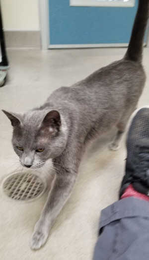 This female domestic short hair cat has a gray coat.