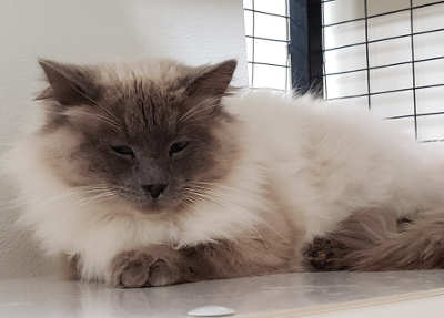This Siamese cat of undetermined gender has a long coat and blue eyes.