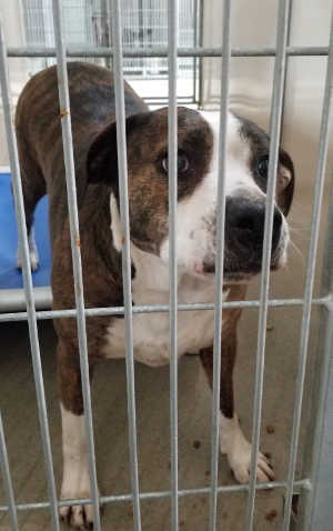 “Baylee” is a female pit bull terrier has a short brindle and white coat.