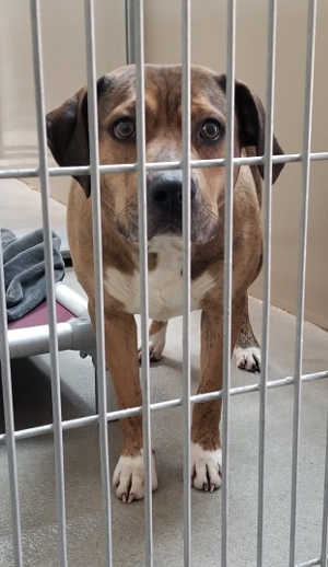 “Bobby Socks” is a female Staffordshire bull terrier-Rhodesian Ridgeback.
