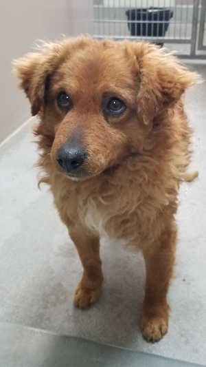 This male terrier-cocker spaniel mix has a curly red coat.