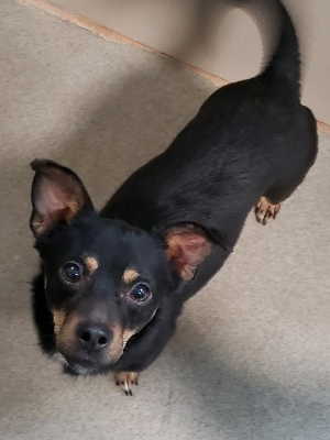 “Hopps” is a male terrier-Chihuahua with a short black and tan coat.