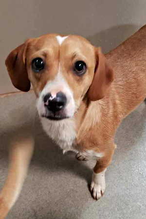 “Buddy” is a male beagle with a short brown and white coat.