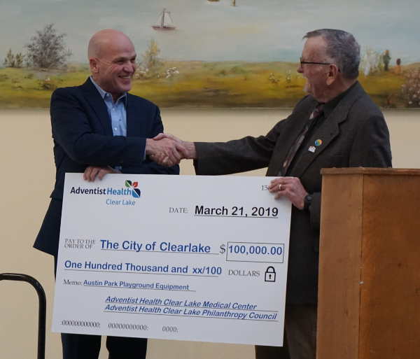 In a special joint meeting of the Clearlake City Council and Clearlake Planning Commission, David Santos, the president and chief executive officer of Adventist Health Clear Lake, presented a check for $100,000 to Mayor Nick Bennett.