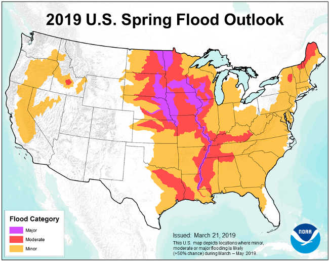 Nearly two-thirds of the Lower 48 states face an elevated risk for flooding through May, with the potential for major or moderate flooding in 25 states, according to NOAA’s U.S. Spring Outlook.