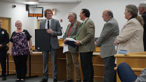 When the meeting got under way, the council presented a farewell proclamation to Folsom. The entire council came down off the dais to stand with Folsom in front of the audience for the reading.