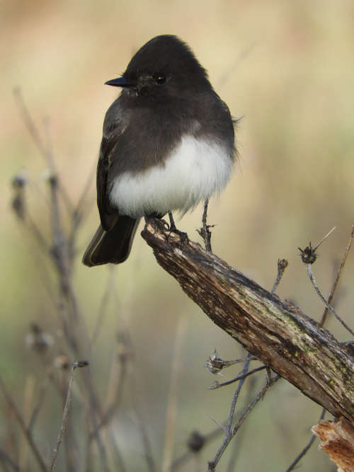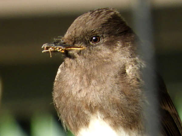 The black phoebe’s eggs are glossy white (sometimes with spots at the larger end) and there are usually up to six in a clutch. The chicks are fuzzy gray when they hatch, but they’ll fledge out in about eighteen days. Adult males and females have identical coloring so it’s hard to tell them apart, but the juveniles are recognizable by the buff-colored bars on the feathers of their wing-caps.