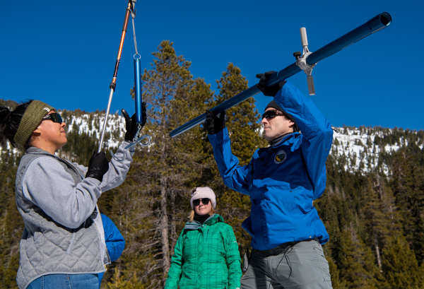 The Phillips snow course is one of hundreds that will be surveyed manually throughout the winter. Manual measurements augment the electronic readings from about 100 snow pillows in the Sierra Nevada that provide a current snapshot of the water content in the snowpack.