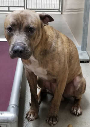 “Tank” is a male pit bull terrier with a short brown brindle coat.