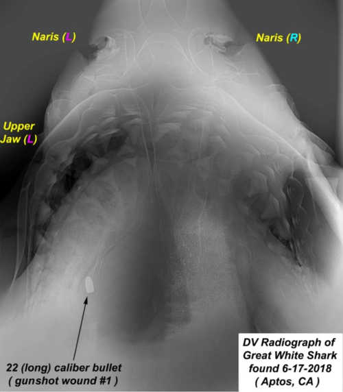 A necropsy or animal autopsy performed on the shark confirmed that it had been killed by multiple shots from a .22 caliber firearm.