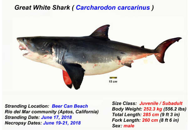 Wildlife officers from the California Department of Fish and Wildlife began their investigation on June 17, 2018, immediately after the 9-foot male white shark washed up on Beer Can Beach in Aptos.