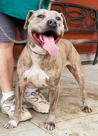 “Tank” is a male pit bull terrier with a short brown brindle coat.