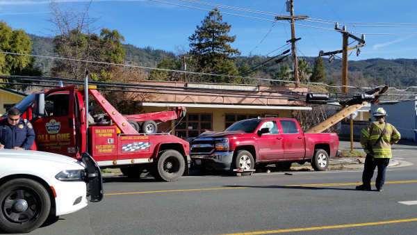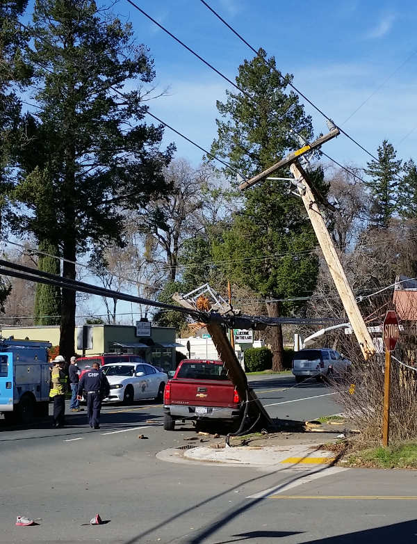 The outage began at the same time as a Chevy Silverado pickup hit a power pole at Highway 20 and First Avenue, snapping it in two, as Lake County News has reported.