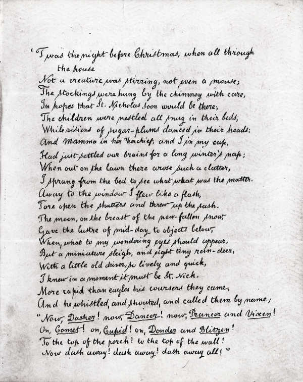 When it was published in 1823, it was printed with no name attached. It wasn’t until 13 years later that American professor and poet Clement Clarke Moore claimed ownership of the by-then famous holiday poem.