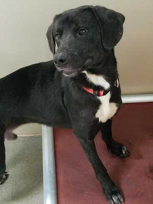 This female Labrador Retriever has a medium-length black coat with white markings.