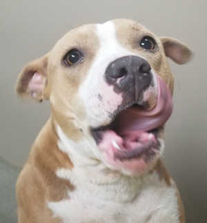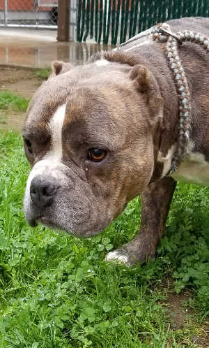 “Lona” is a female pit bull terrier with a short black and white coat.