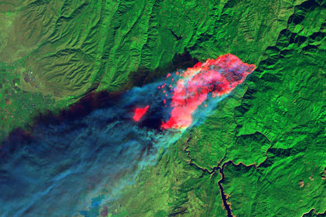 The satellite recorded visible and infrared wavelengths. Short-wavelength infrared, or SWIR, light (1.2- to 3-micron wavelength) is captured in two bands with Landsat 8, and these SWIR wavelengths are emitted by burning materials and penetrate smoke and aerosols, allowing a detailed picture of the fire’s progress.