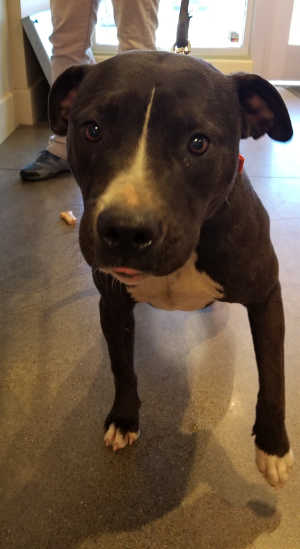 “Saint” is a male American Bulldog-pit bull terrier mix.