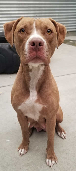 “Cally” is a female pit bull terrier with a short tan and white coat.