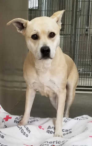 This female Labrador Retriever-pit bull mix has a short cream-colored coat.