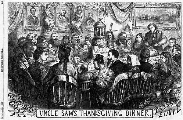 Harper’s Weekley’s “Uncle Sam’s Thanksgiving Dinner,” from November 1869, by Thomas Nast. Library of Congress Prints and Photographs Division Washington, D.C. 20540 USA. It should come as no surprise that Thanksgiving – the holiday during which millions of American families gorge themselves on Turkey, pies and stuffing – has become warped from its original design.