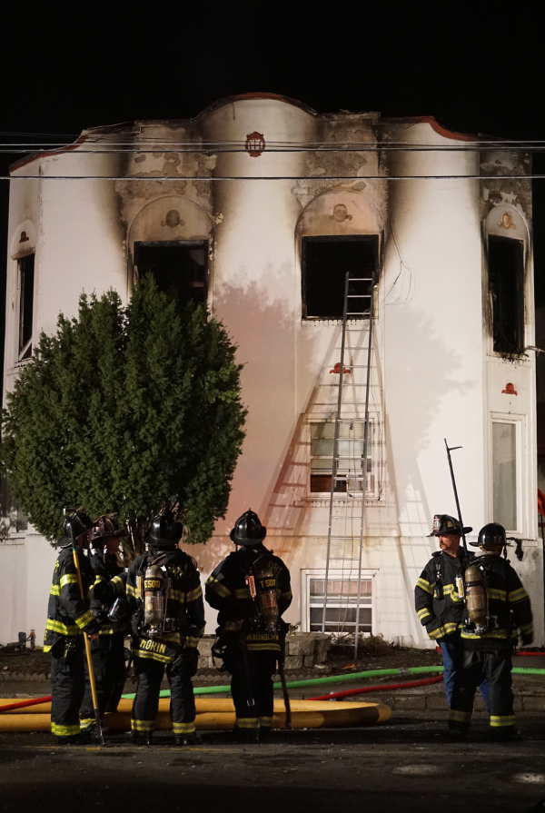 Firefighters with flashlights inspected the top stories of the building and continued to make sure that the fire was out, using hoses to shoot water through the interior roof spaces, which resulted in small fountains of water shooting out the back of the roof.