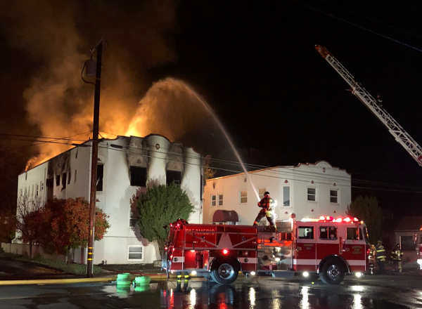 LAKEPORT, Calif. – Firefighters and police remained throughout the night Sunday and into early Monday at the scene of a fire that damaged one of the city of Lakeport’s oldest apartment buildings, displaced all of the tenants and sent two police officers to the hospital to be treated for smoke inhalation.