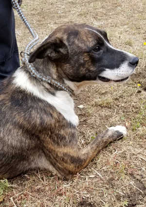 “Saint” is a male American Bulldog-pit bull terrier mix.