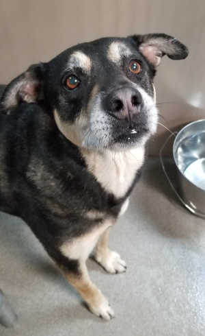 This male terrier-McNab mix has a short black coat.