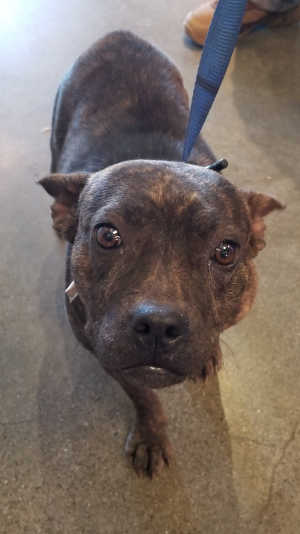This female pit bull terrier has a short brindle coat.