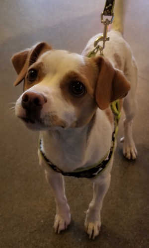 This male terrier has a short white and tan coat.