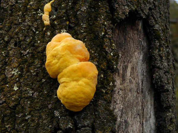 Sulphur shelf doesn’t like it when it’s very wet outside, so it usually shows up around October or November before the rainy season starts. At first, you don’t see the fungus at all as it’s living inside the tree and bark, doing its thing as a web of tiny hair-like mycelium. When the fruiting body of the fungus finally emerges onto the surface of the tree, it looks like small yellow-orange swellings that over a period of a few days turn into larger lumps with lobes, like small brains.