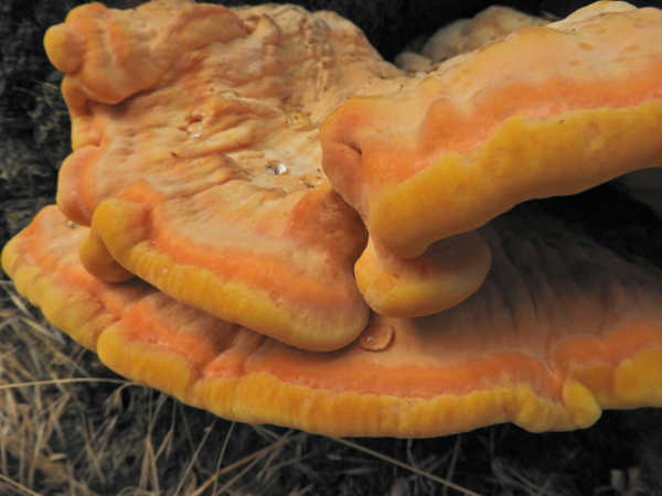 Sulphur shelf is known by many different common names including crab of the woods and chicken of the forest, which reflect its supposedly edible nature. Some say it tastes like chicken, others say it tastes like lobster.