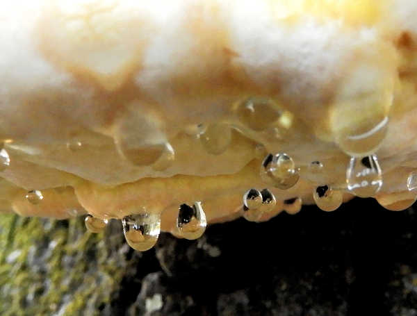 You may also see what look like tears or sweat coming from the fungus. These droplets of nearly clear liquid are actually beads of excess moisture the fungus exudes when its growing.