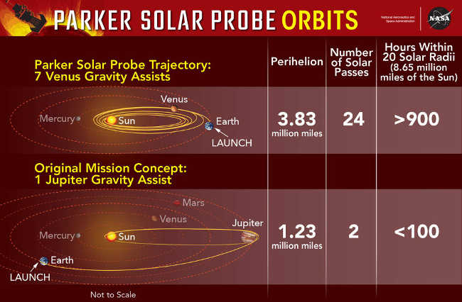 Though Parker Solar Probe doesn't get as close to the Sun, this version of the trajectory provides the spacecraft with more than 900 hours in this critical inner region of the Sun's corona, within 20 solar radii (about 8.65 million miles). In comparison, earlier designs using Jupiter gravity assists provided less than 100 hours in this region.