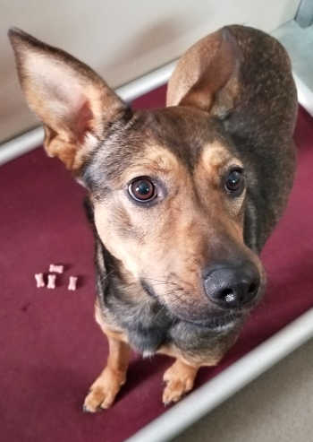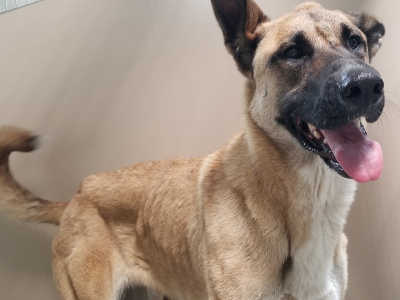 “Hashi” is a male pit bull terrier-shepherd mix.