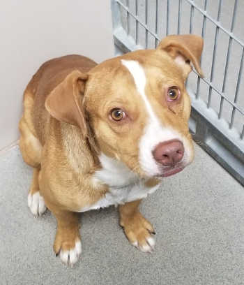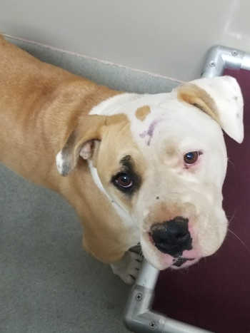 This pit bull terrier of unreported gender has a short tan and white coat.