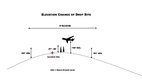 “The VLAT initiated the retardant drop as identified by the smoke trail. Obscured by heavy vegetation and unknown to the VLAT pilot, a rise in elevation occurred along the flight path. This rise in elevation resulted in the retardant drop only being approximately 100 feet above the treetops at the accident site,” the narrative explained.