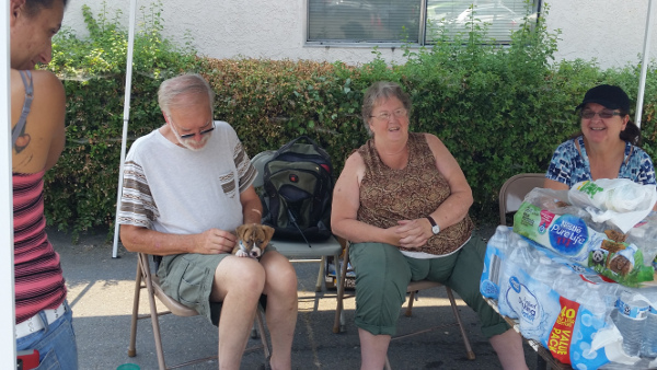 Across Tenth street in the First Lutheran Church parking lot, church members continue to dispense dog food and canned cat food until the supplies run out. Passersby are loudly told "welcome home", offered pet food and a kind ear to hear people's stories.