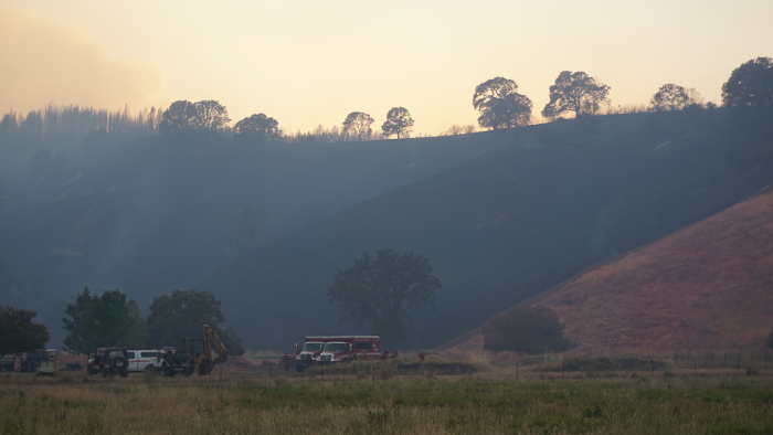 Dozers lines have been cut around homes and buildings, bright yellow fire hose snaked across driveways, and clusters of engines and lead personnel parked along the valley, which was hemmed in by a thick smoke layer.