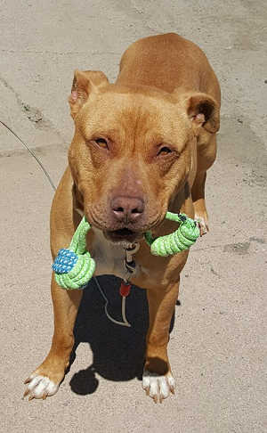 He has a mellow disposition, loves to play fetch and tug-o-war. Shelter staff said he is a “super friendly guy” who needs some leash work.