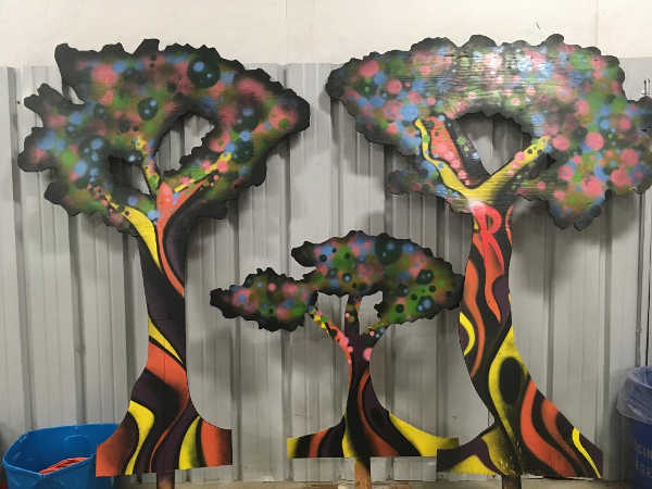 Set painter Adam Garrett is a master with a can of spray paint and has created the grooviest trees and skyscrapers you've ever seen.