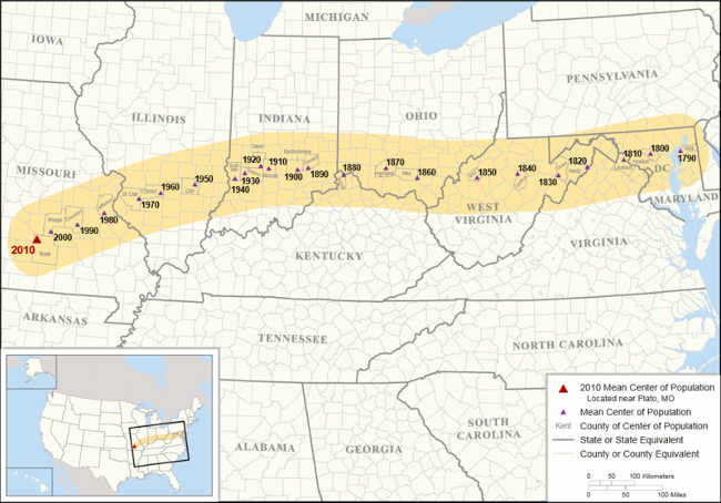 After more than a century of inching westward, the mean center entered the state of Missouri, where it has remained since 1980.
