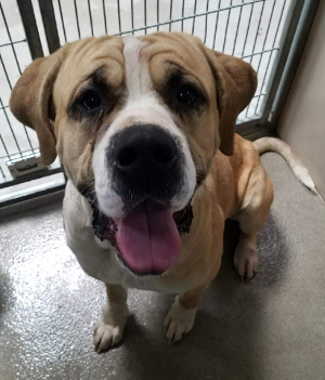 This male mastiff mix has a short tan and white coat.