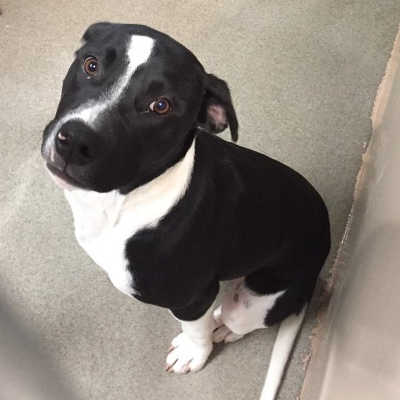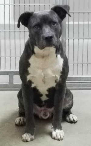“Kumo” is a male pit bull terrier with a short blue and white coat.